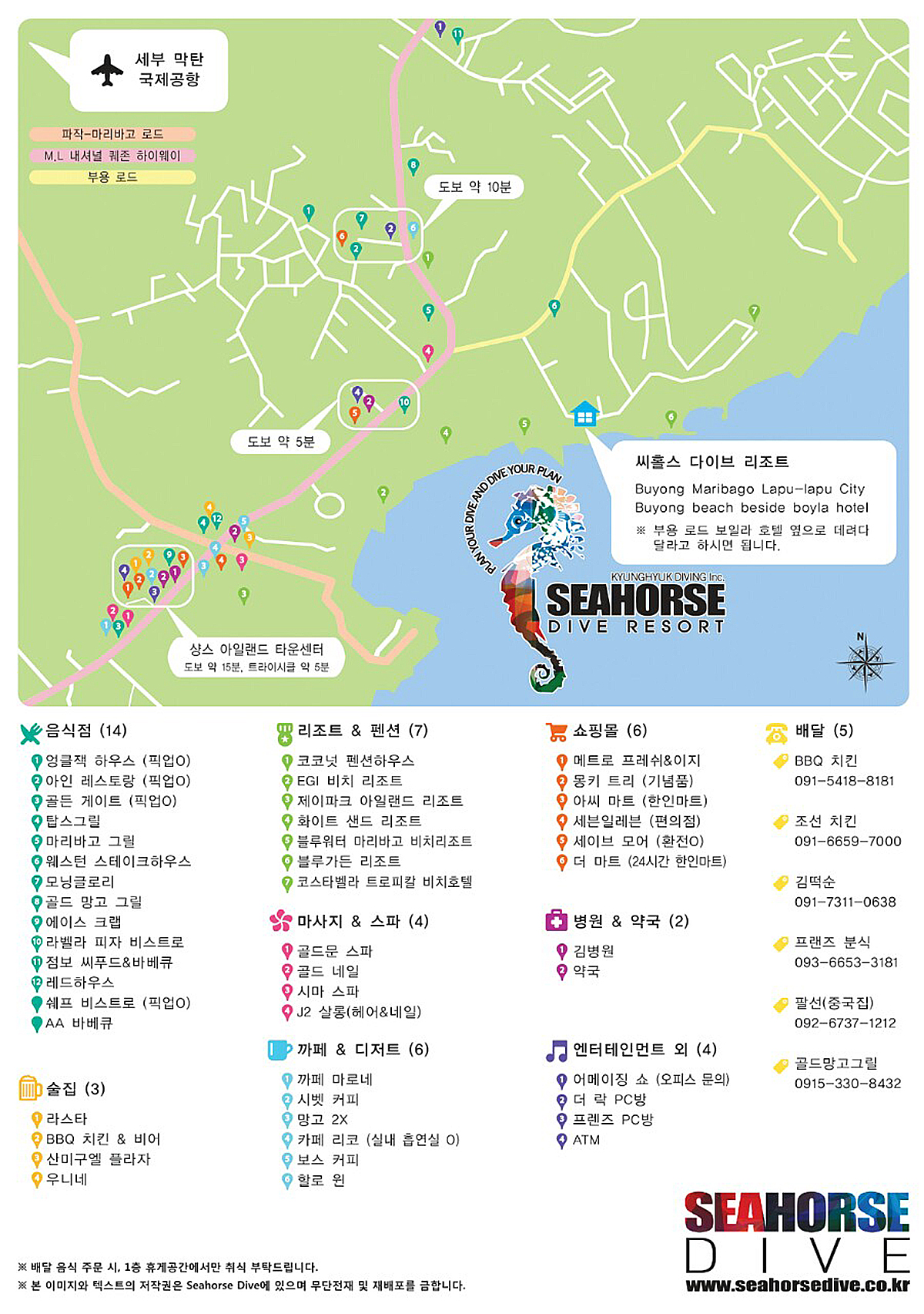 씨홀스 다이브는 막탄 번화가에 있으며 도보로 슈퍼마켓, 마사지샵, 주변 맛집으로 이동가능하신 시내에 위치해 있습니다.